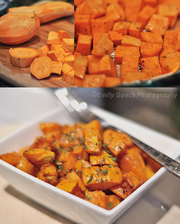 1. Peel and dice the sweet potatoes into approximately 1″ chunks. (Make sure all the pieces are similar in size for even cooking time.)